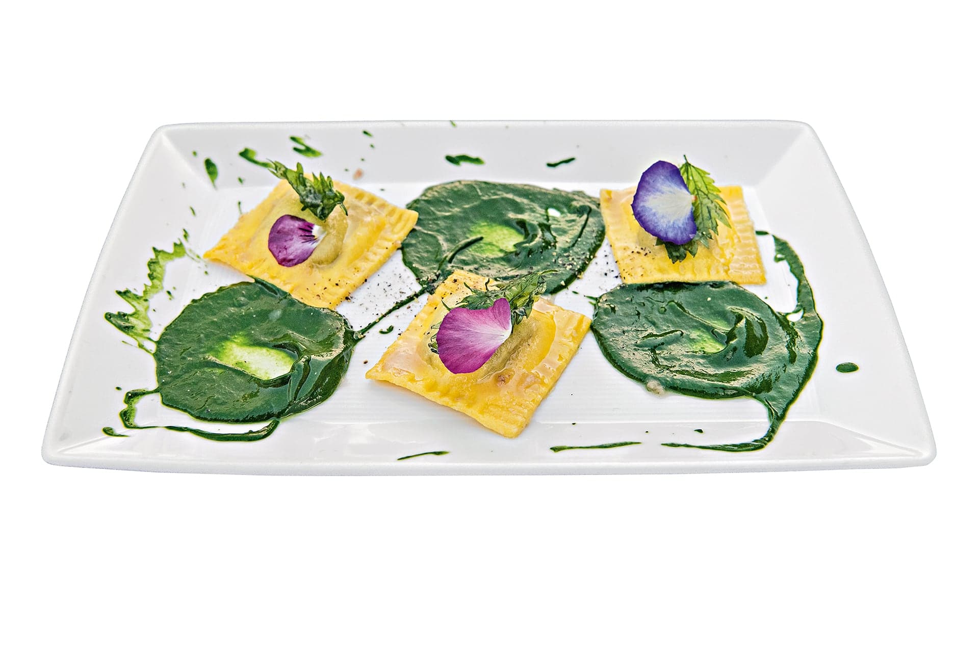 Le Violette in reichlich Salzwasser kochen und abtropfen lassen. Die Brennnesselcreme auf den Teller geben, Le Violette mit dem geschmolzenen Schmalz bestreichen und mit den frittierten Brennnesseln und frischen Wildblumen dekorieren.