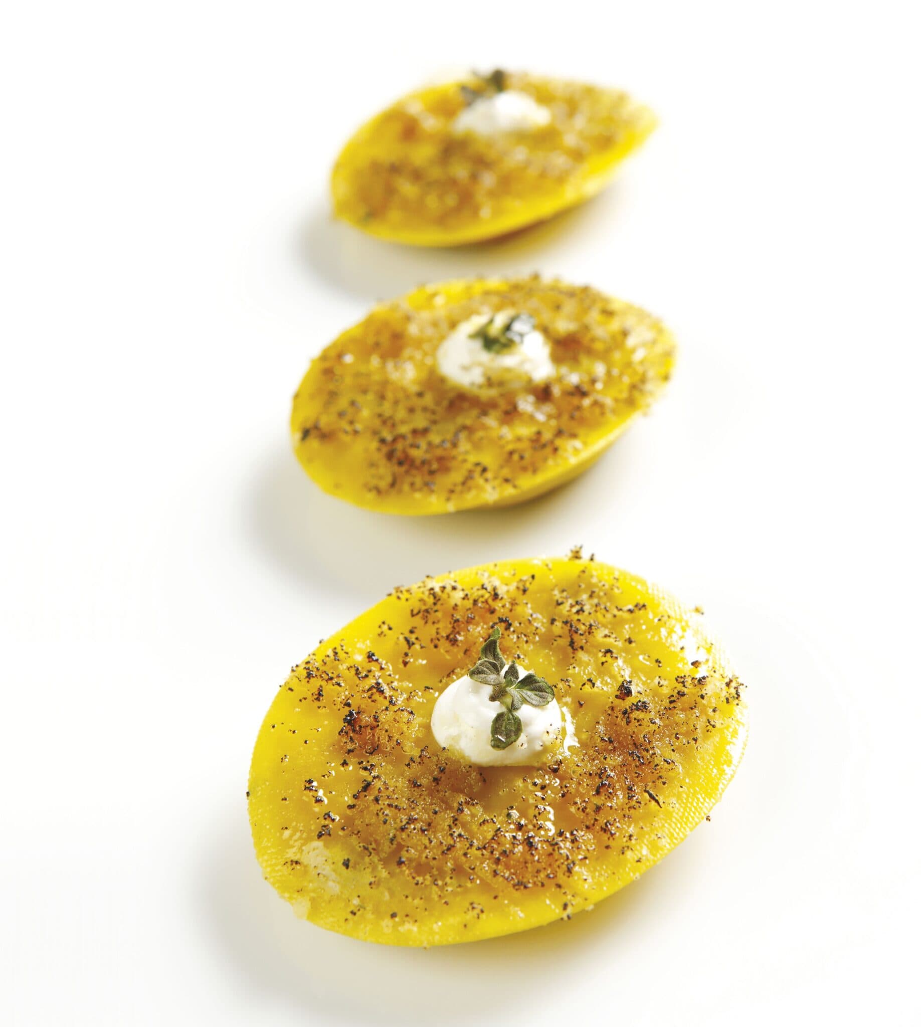 Panciotti® mit Auberginen und Scamorza Käse, Tomatenwasser, aromatisiertes Brot und Joghurt