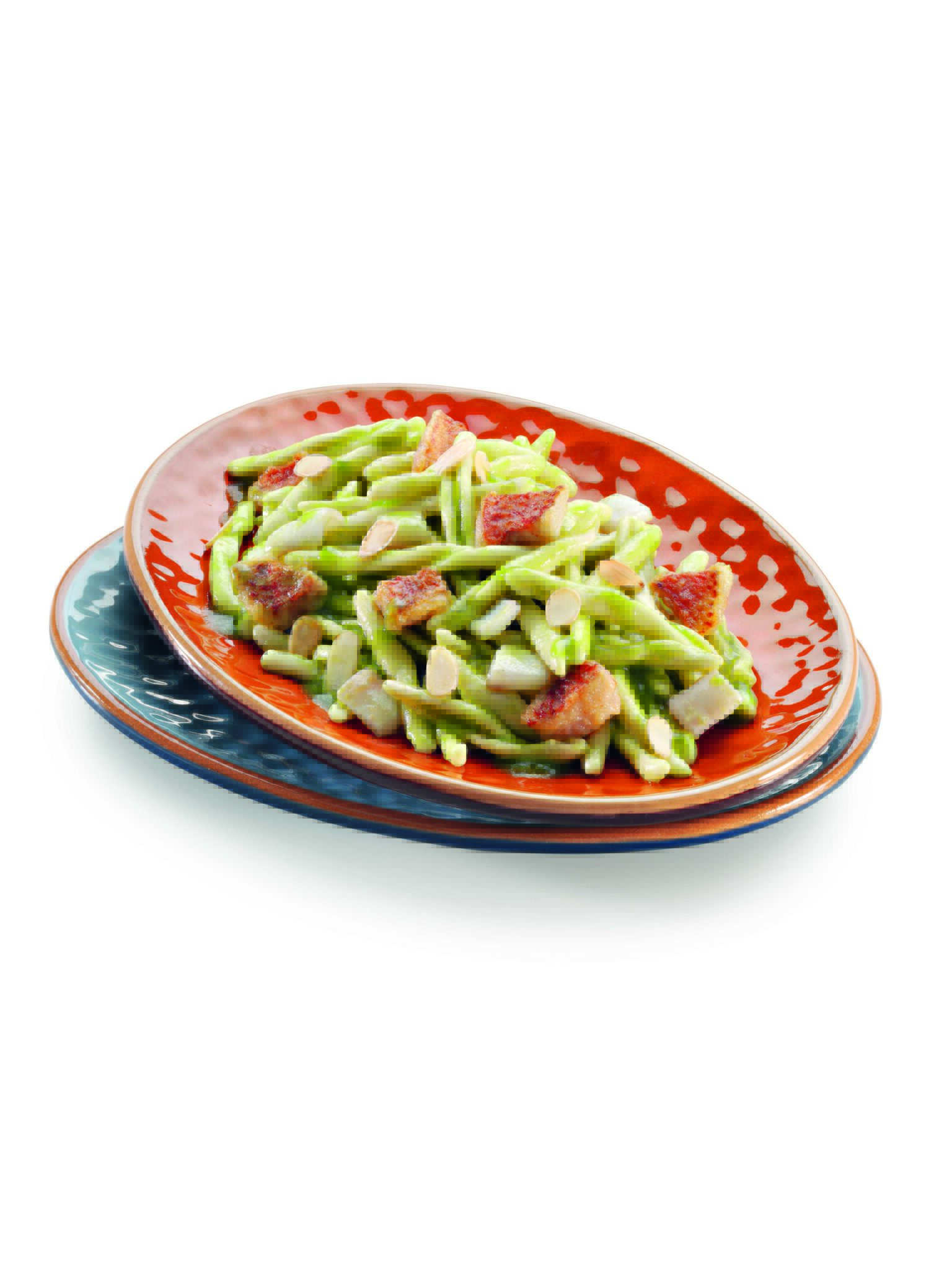 Cocinar I Riminesi (especialidad de Rimini) durante 2-3 minutos en agua hirviendo con sal, y terminar la cocción en la sartén con la salsa. Emplatar y decorar con las almendras tostadas.