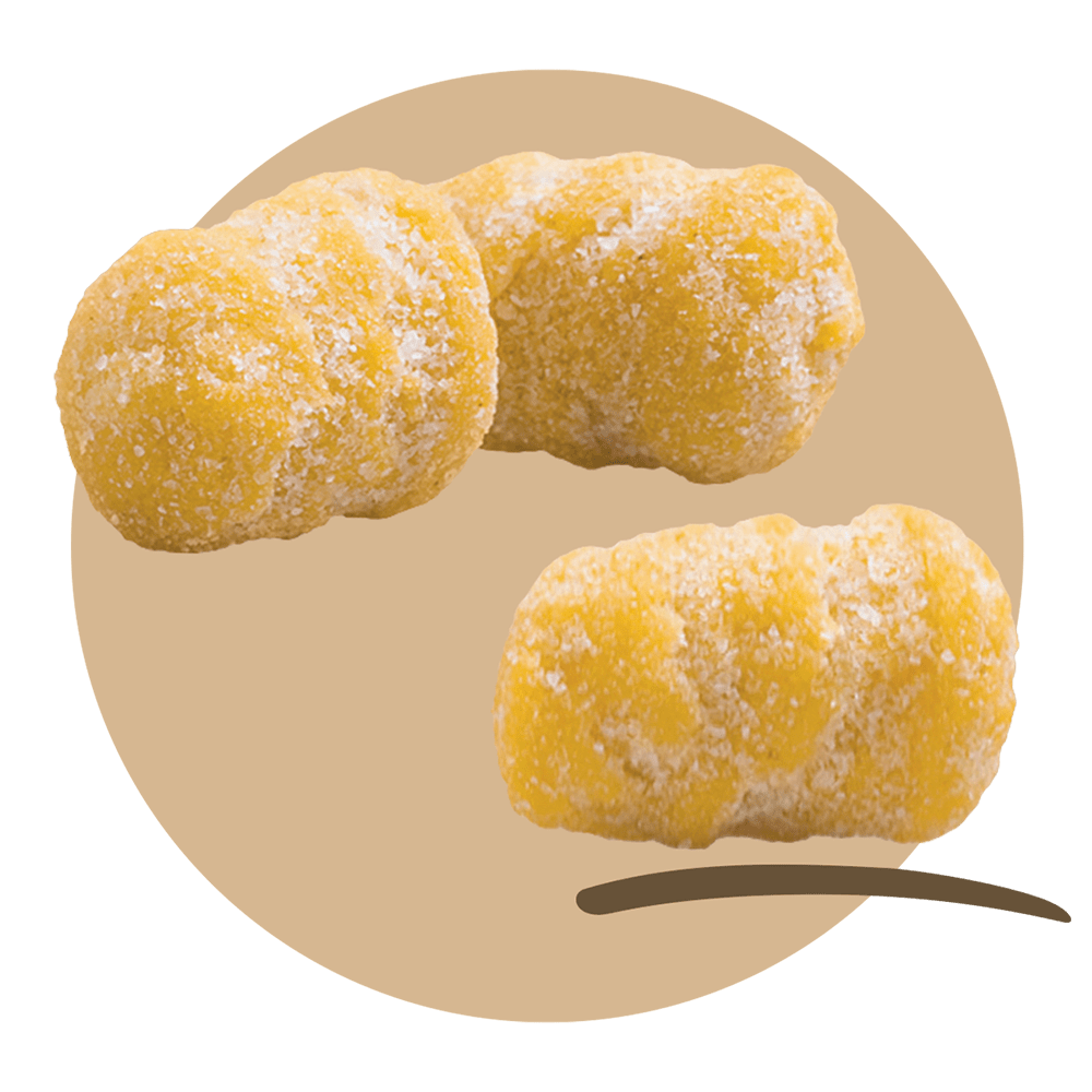 Purea di patata (82%) (acqua, fiocchi di patate (patata 99%, emulsionanti: mono e di gliceridi degli acidi grassi, spezie) fecola di patata), purea di zucca (37%) (acqua, zucca disidratata 16%, succo di zucca concentrato 1%), farina di grano tenero tipo “00”, uova, Grana Padano DOP (latte, sale, caglio, lisozima da uovo), zucchero, sale, noce moscata. Farina di riso spolverata in superficie.