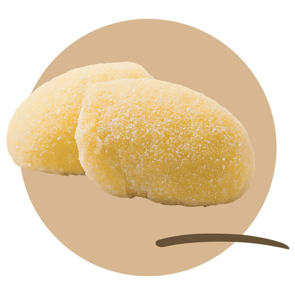 Purea di patata 91% (acqua, fiocchi di patate 38% (patata 99%, emulsionanti: mono e di gliceridi degli acidi grassi, spezie), fecola di patata), farina di grano tenero tipo “00”, uova 1,5%, sale, Farina di riso spolverata in superficie.