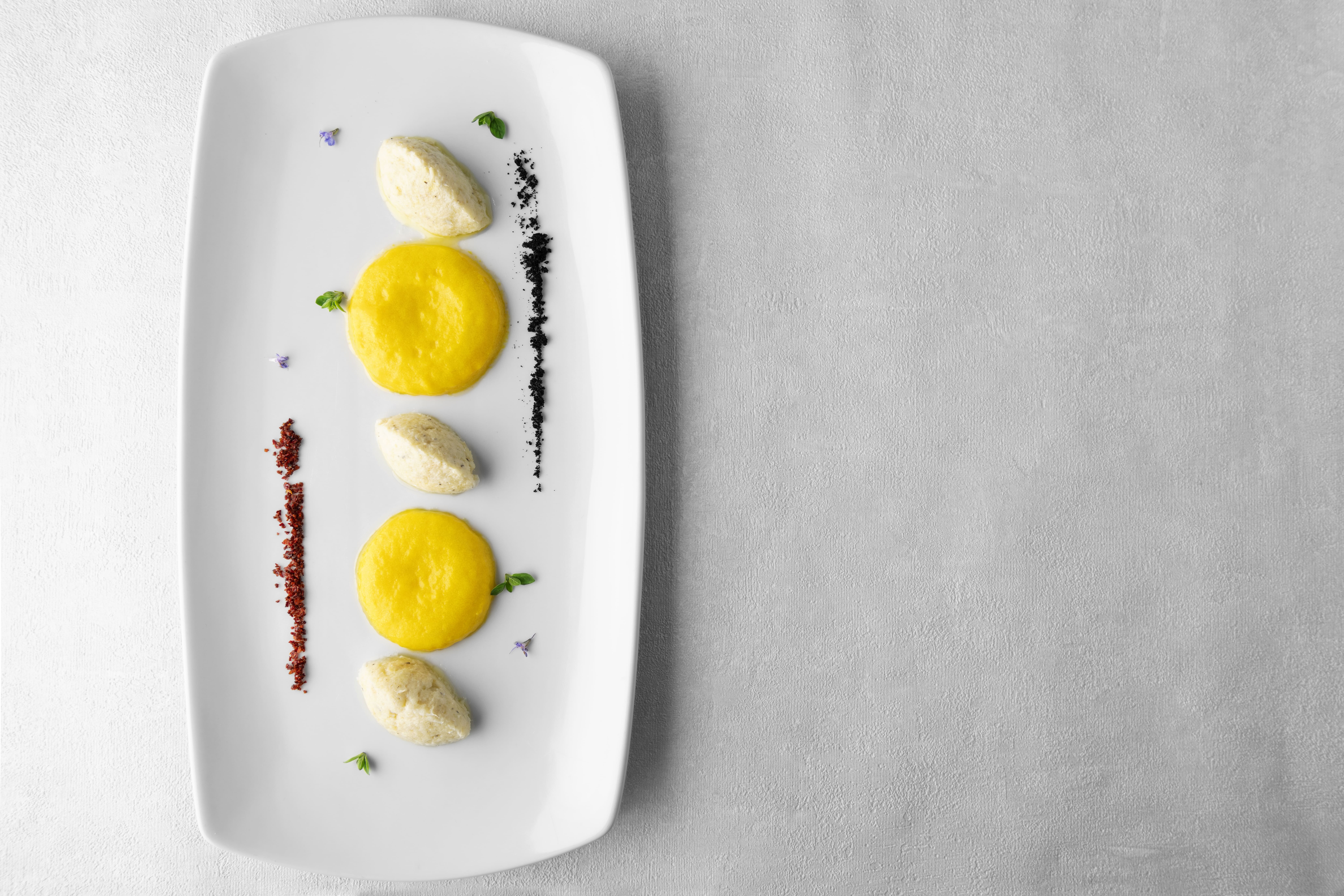 Formare delle piccole quenelle di baccalà alternate al soffice di zafferano. Ultimare con le polveri e qualche foglia di erbe aromatiche.