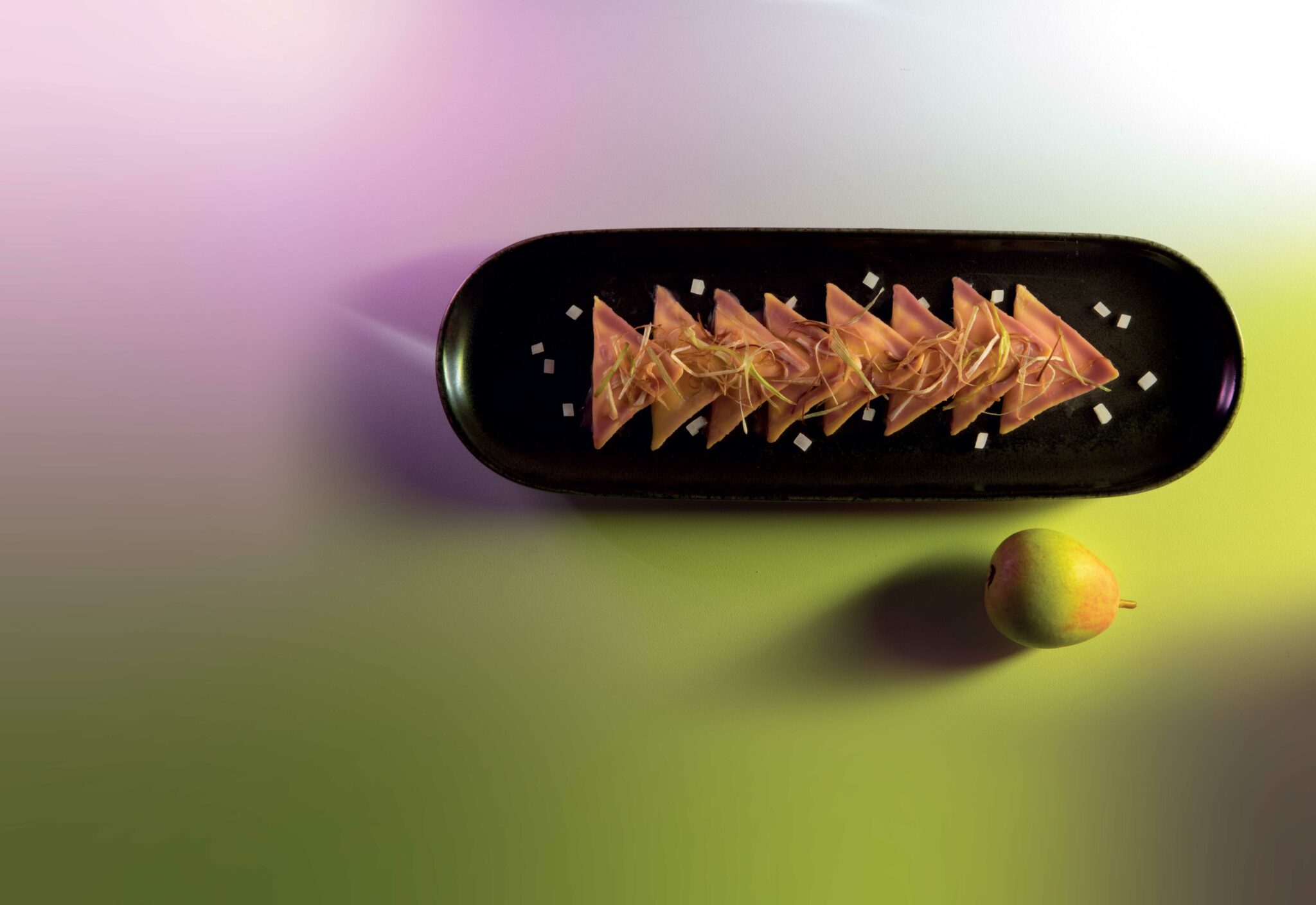 Triangoletti al Parmigiano Reggiano, pere in osmosi al pepe bianco, paglia di porri croccante, ganache al cioccolato Ruby e lamponi