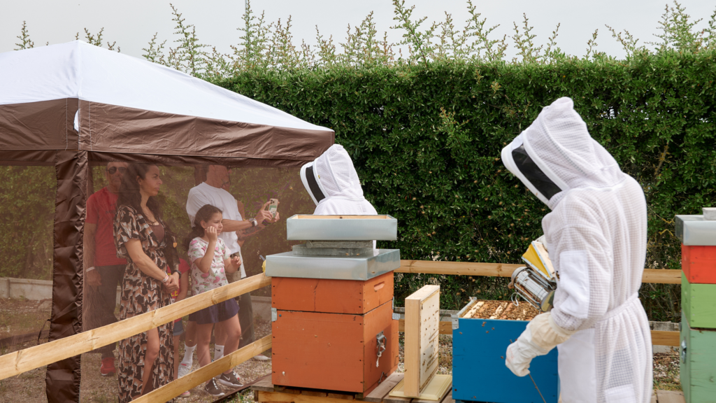 Gli ospiti sono stati invitati ad avvicinarsi agli apiari, protetti da una tenda allestita appositamente, che permetteva di osservare in sicurezza l’attività intensa delle api.