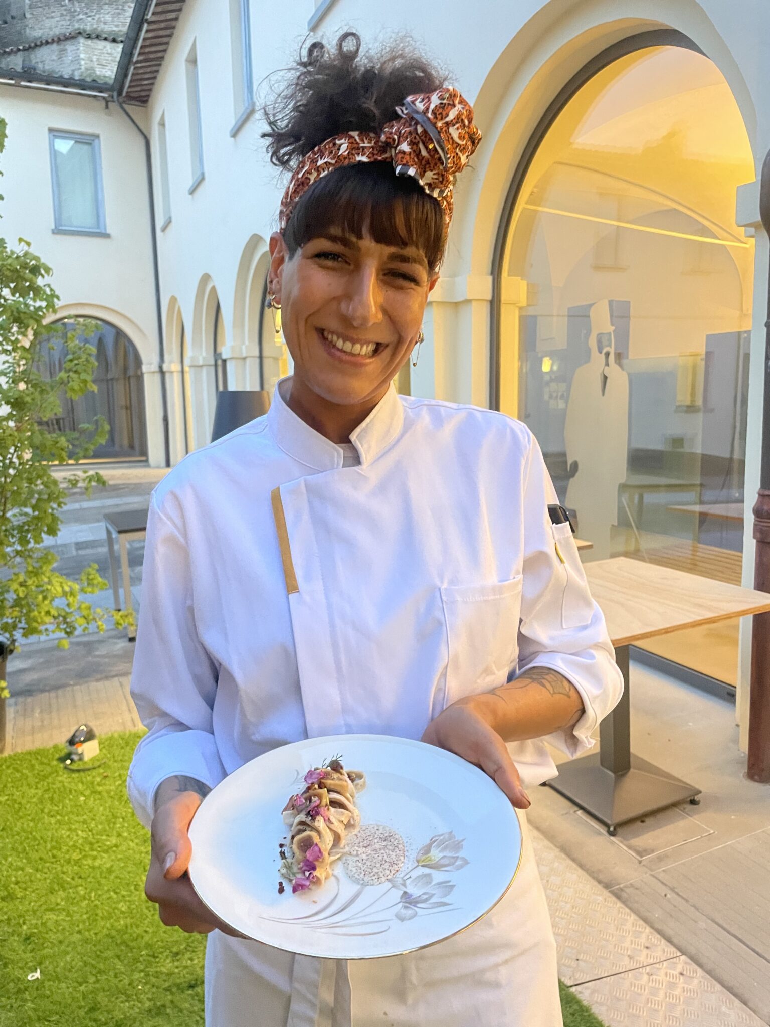 Nel contesto della Festa Artusiana 2025, i vincitori sono tornati ai fornelli per proporre un fuori menù esclusivo: tra loro, la pastry chef iraniana Mina Karimi, terza classificata, ha catturato l’attenzione degli ospiti con il suo dessert “Intreccio iraniano – Pich-o-Tab-e Irani”. Questa creazione è un vero e proprio omaggio poetico alla tradizione artusiana: il piatto si apre con tagliatelle realizzate con farina di farro integrale Bio di Surgital che richiamano la storica “balsamella” artusiana, e prosegue con una crema ispirata al “Kashk”, l’antico ingrediente fermentato persiano. In questa reinterpretazione il Kashk dialoga con kefir, panna, fieno e cardamomo, fondendo in un unico boccone la delicatezza italiana con i profumi intensi della Persia.