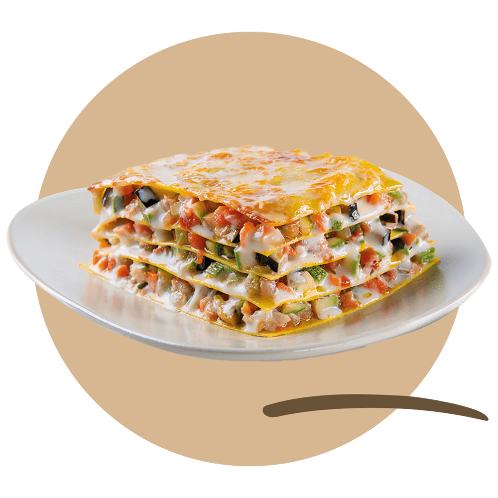 Gemüse 45% (Zucchini, Karotten, Sellerie, Spargel, Zwiebeln, Auberginen, Erbsen), Mischpilze 4% (Champignons, Austernpilze, Steinpilze, Shiitake-Pilze, Stockschwämmchen), Béchamelsosse (Vollmilch, Weizenmehl, pflanzliche Margarine, Kartoffelstärke, Salz), Edamer, Grana Padano DOP Käse, Extra Vergine Olivenöl, Sonnenblumenöl, Basilikum, Salz. Geriebener Grana Padano DOP Käse als Ergänzung des Gerichts.