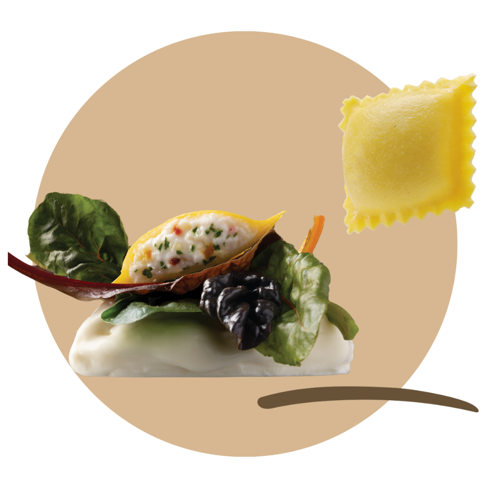 Squacquerone di Romagna PDO 66%, Piadina (Weichweizenmehl Typ „0“, Milch, Schmalz, Eier, Salz, Treibmittel, Frischkäse), Sahne, Mangold 5% Tricolor, Lebensmittelgelatine tierischen Ursprungs, Salz, Pfeffer.