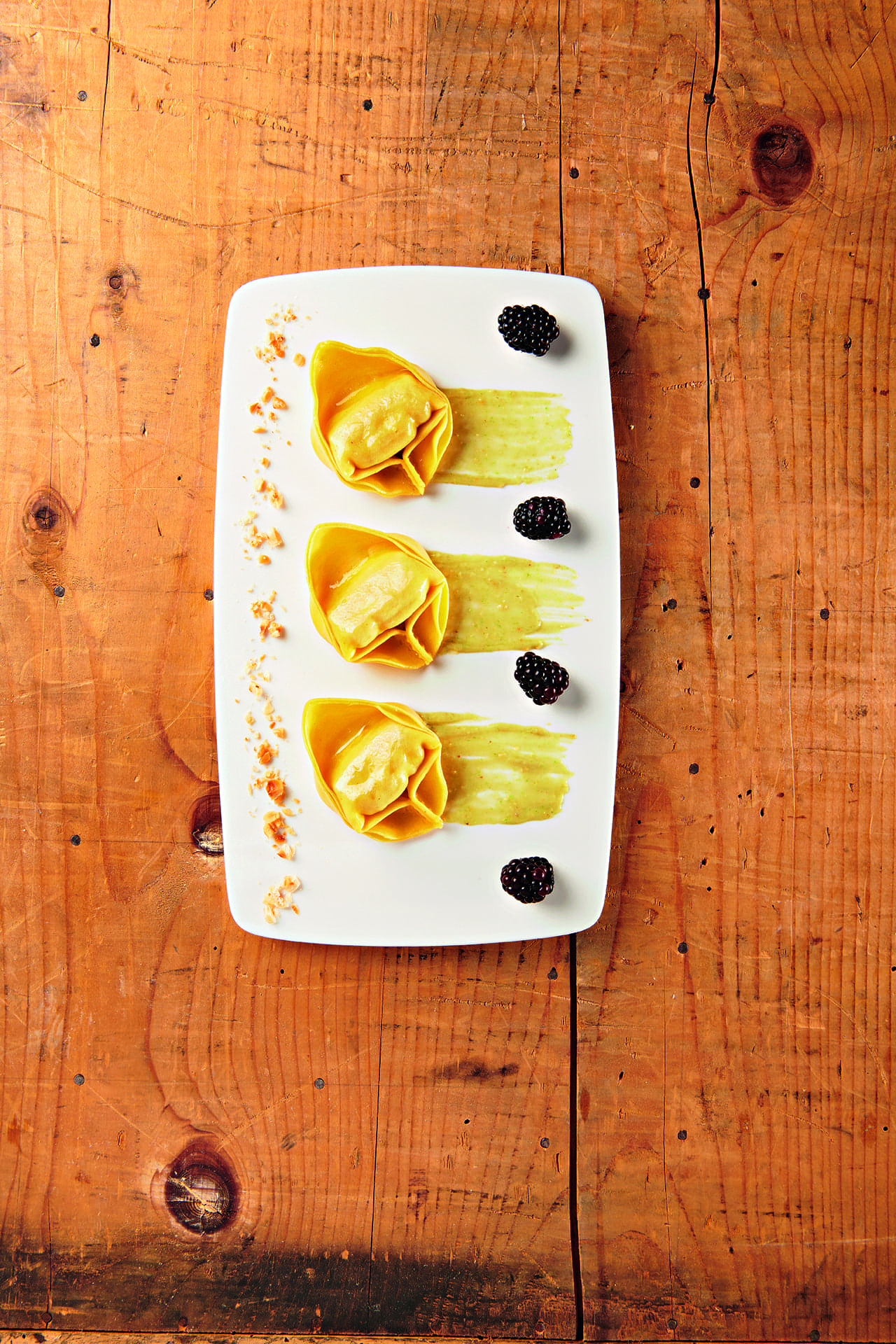 Citrus perfumed raviolacci with sea bass and grilled tomato coulis, turmeric-seasoned potato cubes, sunflower seeds, and goji berries
