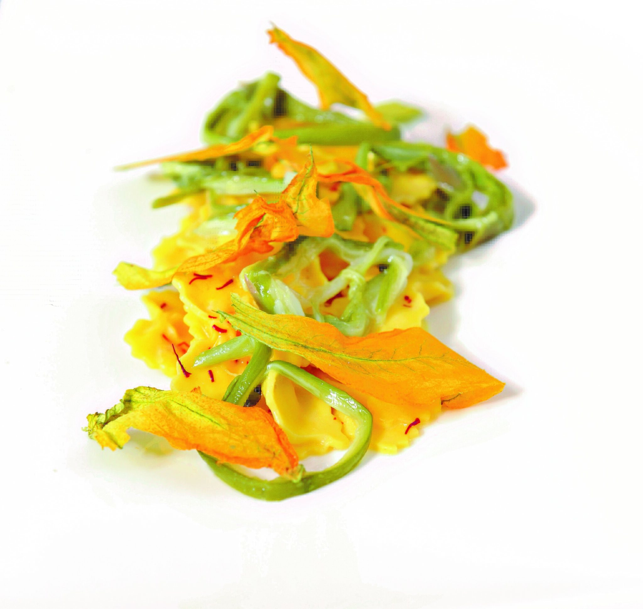Tortellini alla moda di Bologna (with meat) with parmesan broth, burnt leek and bread crusts with celery and tomato gel