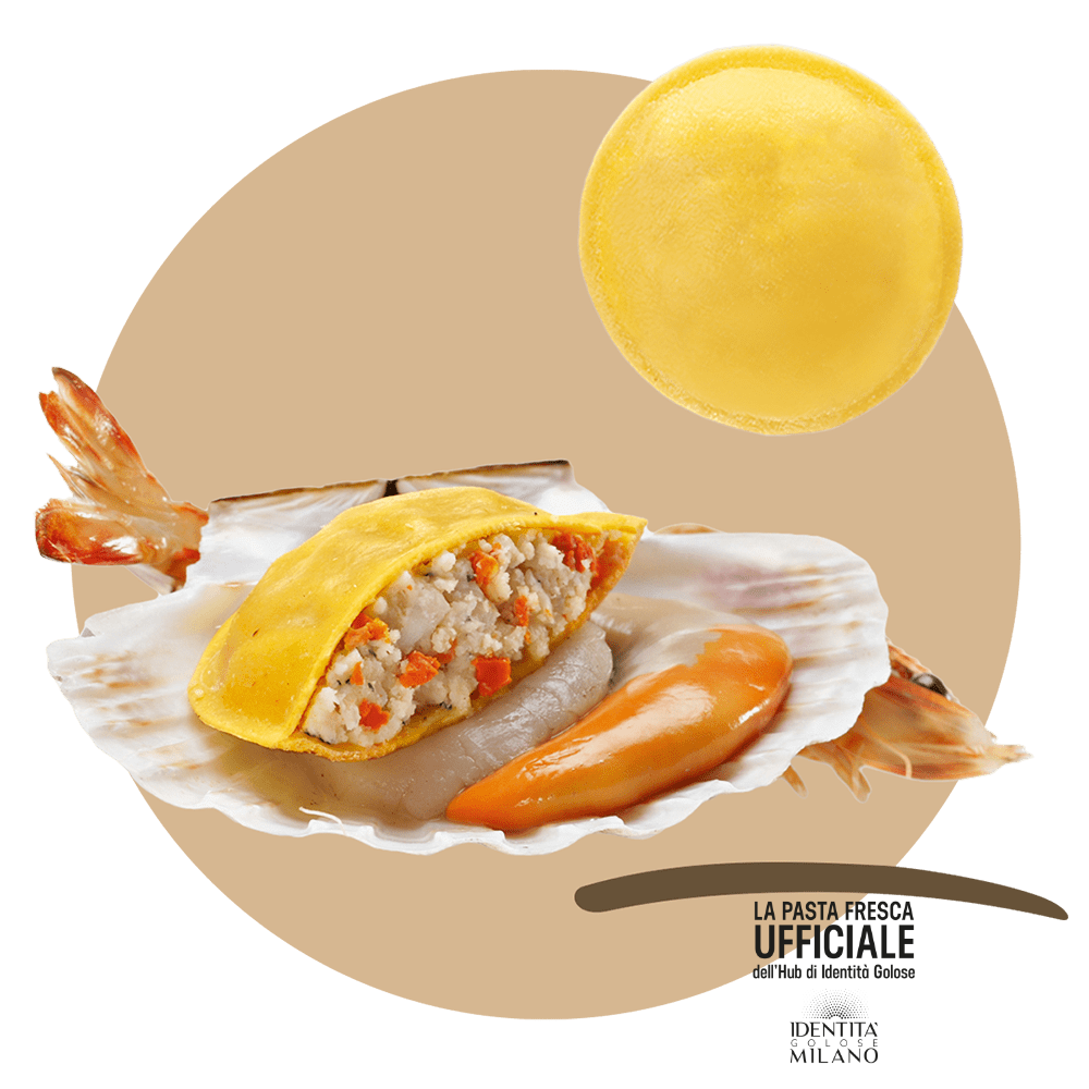 Vieiras braseadas 24%, gambas del mar del norte 23,5%, requesón, queso mascarpone, pan rallado, sal.
