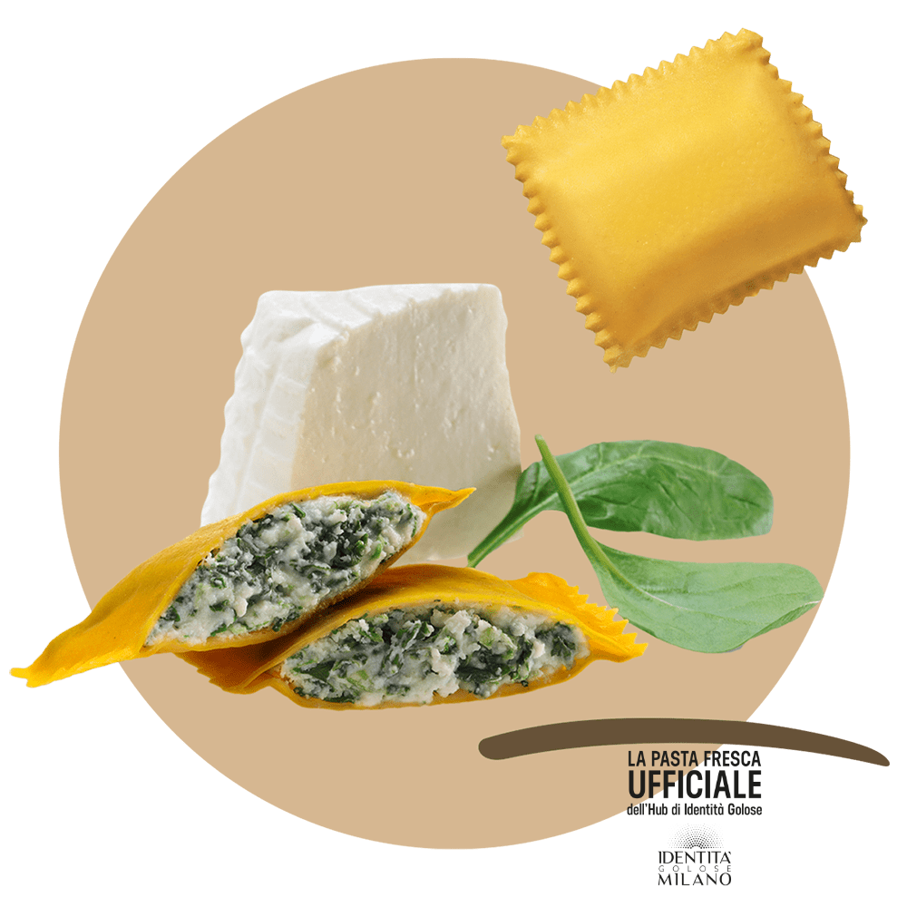 De la ricotta de bufflonne pour 66% de la farce. Parmi toutes les ricottas produites en Italie, celle de bufflonne se distingue nettement des autres par sa saveur particulière et par sa consistance qui est moins granuleuse que les autres ricottas. Les épinards constituent 23% de la farce et seulement leurs petites feuilles, c’est-à-dire la partie plus tendre et savoureuse, sont utilisées.