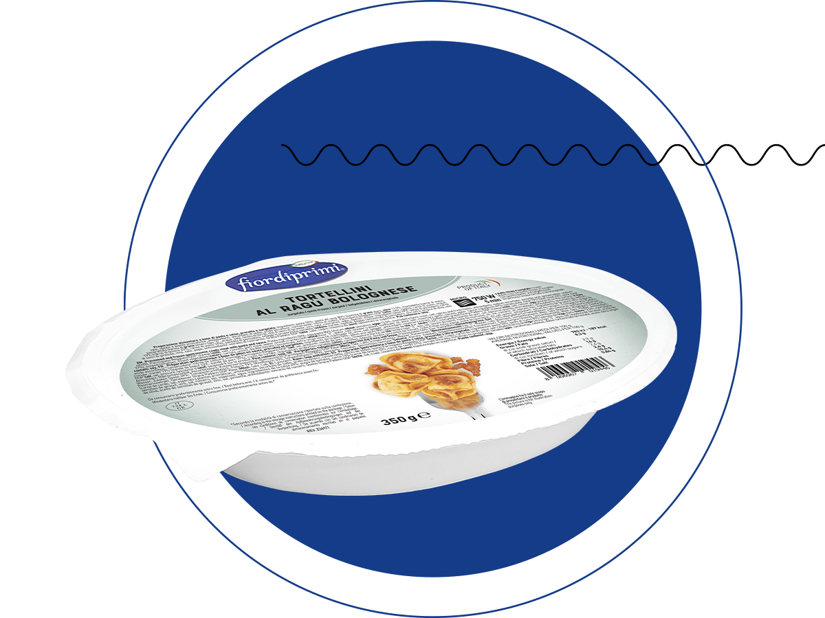 Pâtes aux oeufs 68% (semoule de blé dur, oeufs, eau), farce 32% (mortadelle, Parmigiano Reggiano AOP, viande de porc braisée, chapelure, sel, épices.