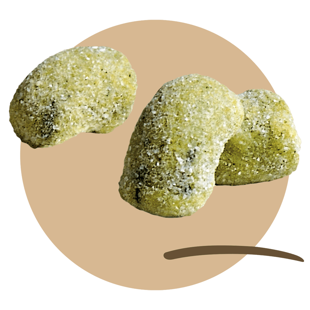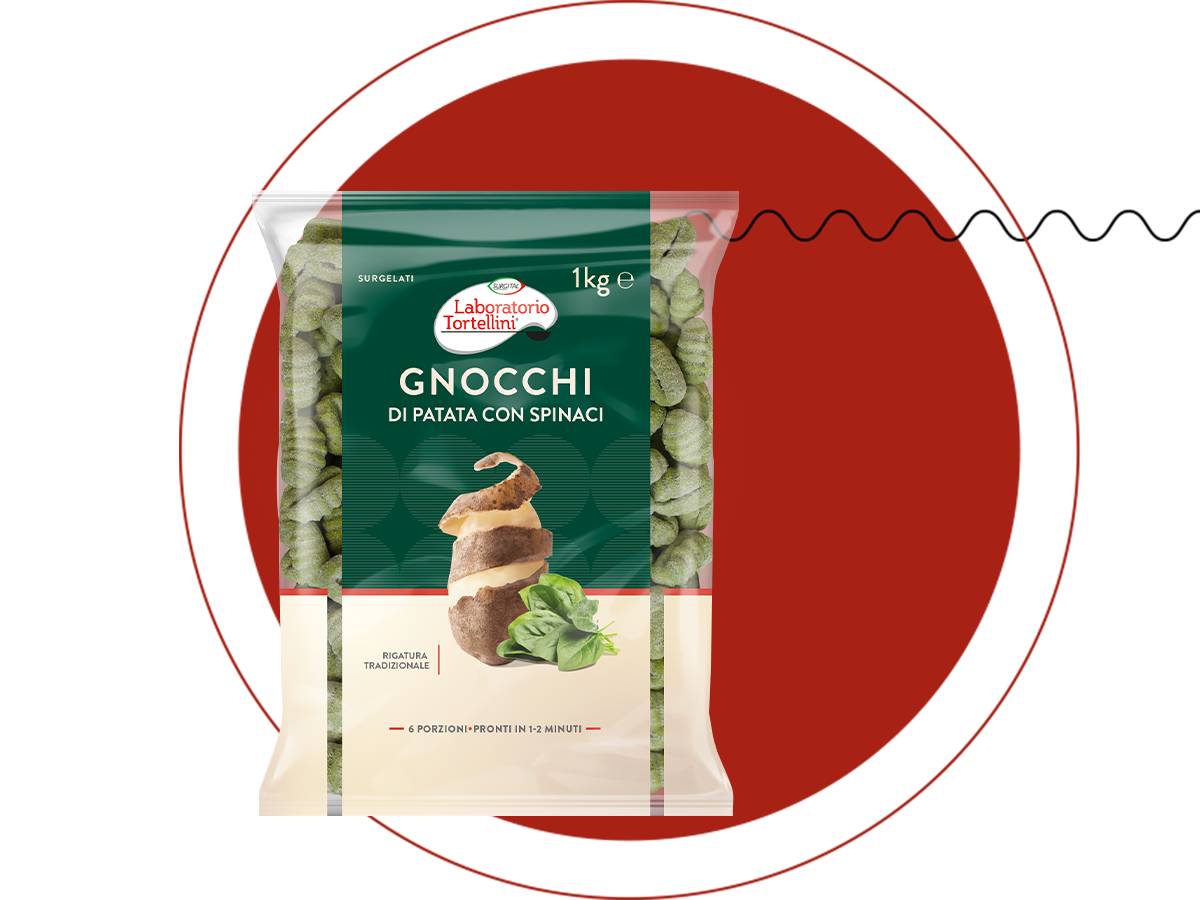Purea di patata 91% (acqua, fiocchi di patate 38% (patata 99%, emulsionanti: mono e di gliceridi degli acidi grassi, spezie), fecola di patata), farina di grano tenero tipo “00”, uova 1,5%, sale, spinaci disidratati 1%. Farina di riso spolverata in superficie.