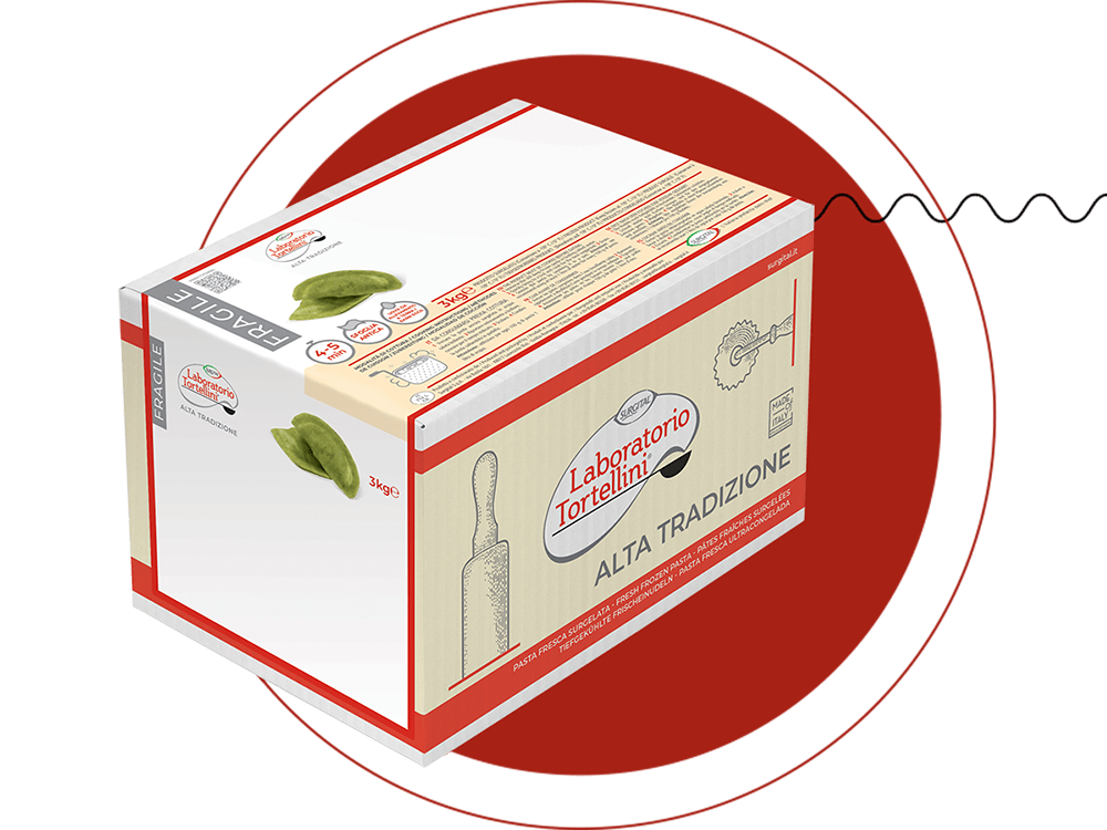 Indicazioni di smaltimento della pasta di Laboratorio Tortellini®. Il sacco va nella plastica e il cartone nella carta. Verifica le disposizioni del tuo comune.
