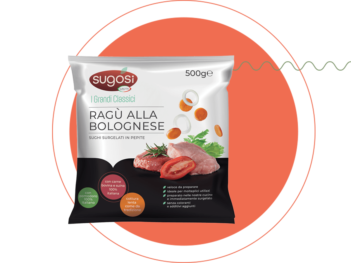 Polpa di pomodoro 42%, carne di bovino 28%, brodo di verdure, doppio concentrato di pomodoro, carne di suino 3,5%, salsiccia di suino 3,5%, olio extra vergine di oliva, cipolla, carote, olio di semi di girasole, zucchero, vino, aglio, pepe, alloro, antiossidante: estratto di rosmarino.