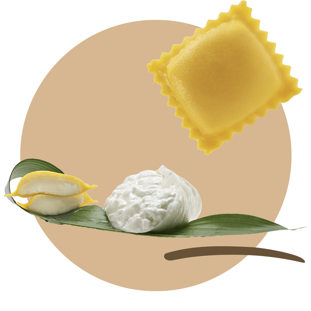 Burrata 59% (latte, crema di latte, siero innesto naturale, sale, caglio, correttore di acidità: acido citrico), ricotta (siero di latte, sale, correttore di acidità: acido lattico), pane (farina di grano tenero tipo “0”, acqua, olio di semi di girasole, latte scremato in polvere, lievito di birra, sale, destrosio, farina di cereali (frumento) maltati), olio extra vergine di oliva, gelatina alimentare di origine animale, uova da allevamento a terra, sale, pepe.