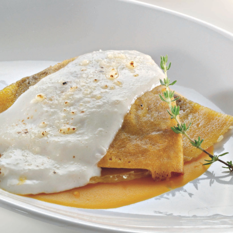 Tortelli alla zucca con spuma di ricotta fresca, alici del mare cantabrico e percezione di cannella