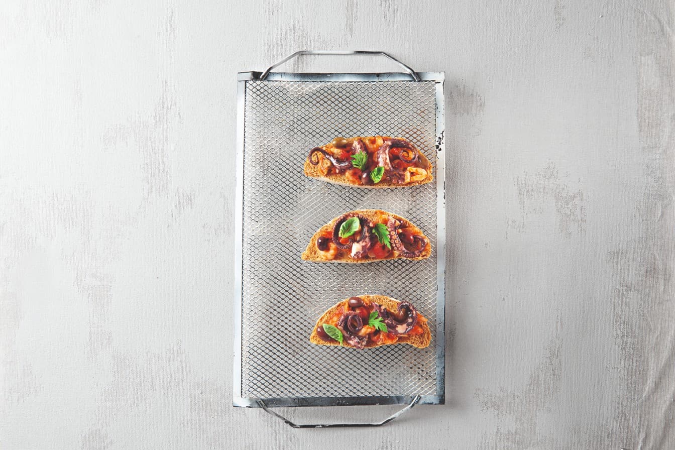 Crostone di pane toscano con salsa pescatora, polpo e olive taggiasche